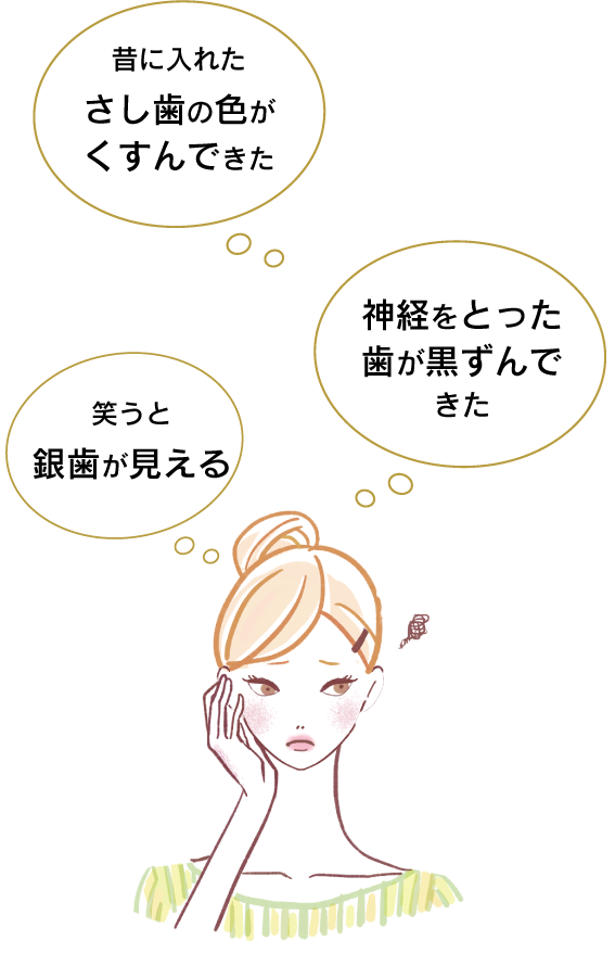 黄ばんだ歯や黒ずんだ歯の表面に、爪のマニキュアのようにうすいセラミックシートを貼り付けることで、ツヤのある白い歯に近づける方法です。